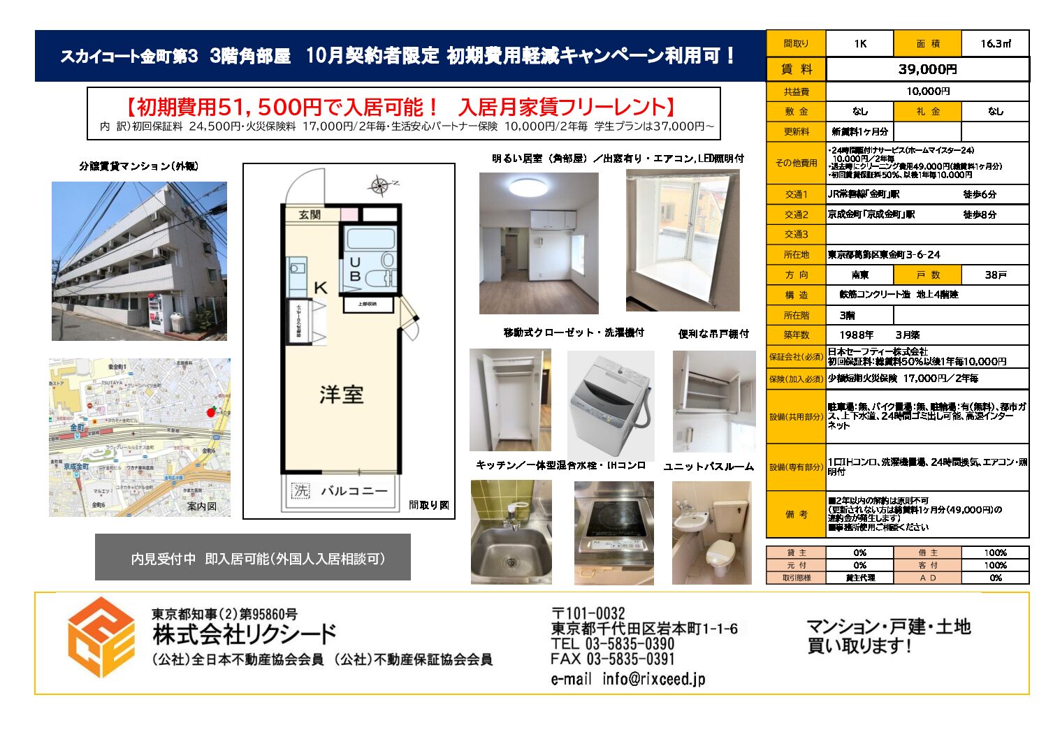 | 入居時初期費用目安 | 51,500円のみ | 所在階 | 3階 |