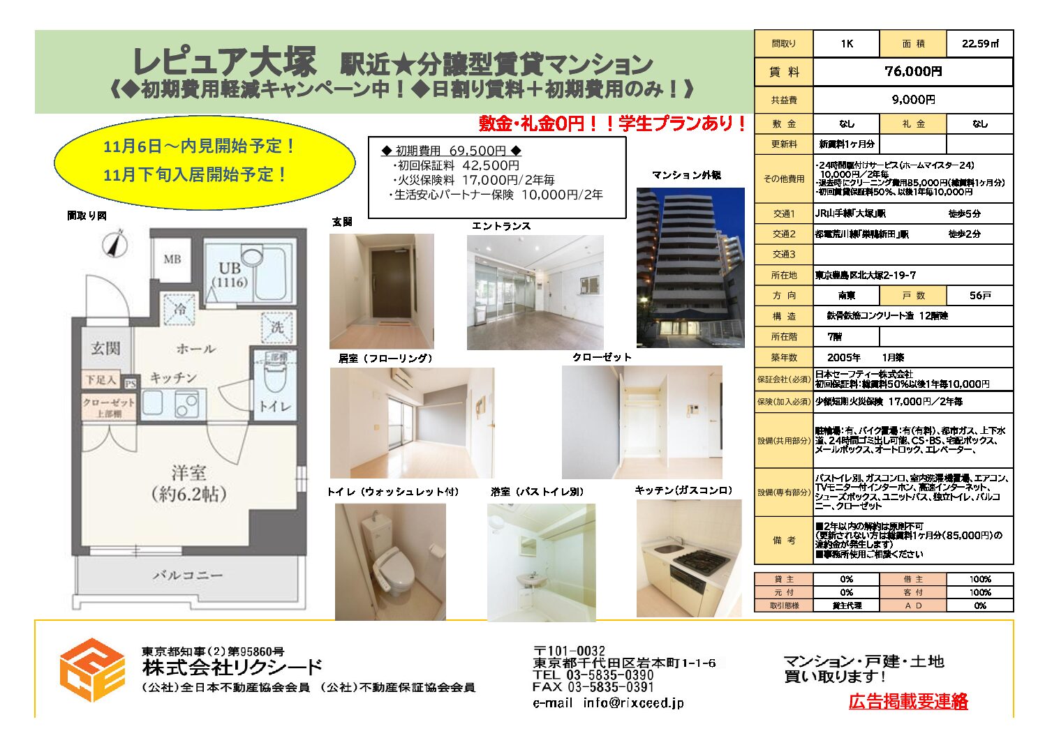 【11月入居者限定初期費用軽減キャンペーン開催中】 =初期費用は69,500円+日割り賃料のみ(敷金・礼金0円)